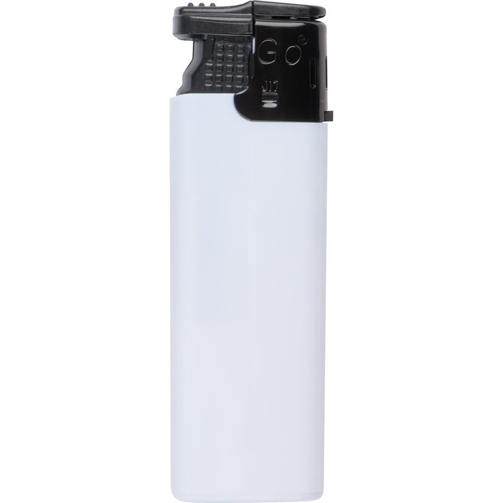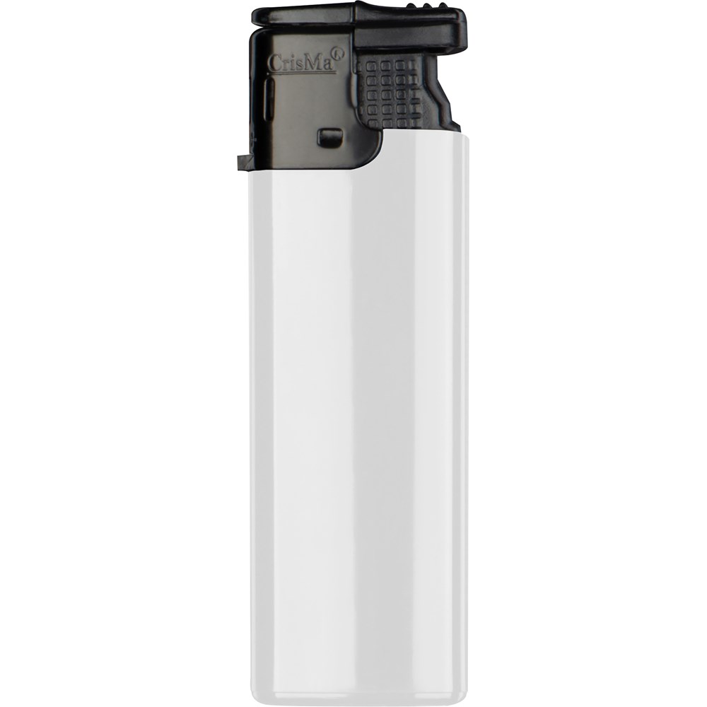 Elektronik-Feuerzeug mit schwarzem Kopf, nachfüllbar. Die Sturmflamme lässt sich stufenlos verstellen. Ihr Werbeaufdruck erfolgt auf einer Seite.
