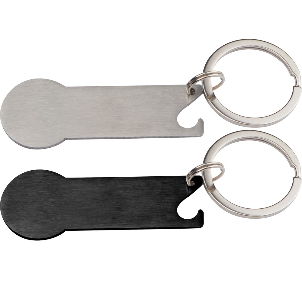 Schlüsselanhänger aus Edelstahl mit integriertem Einkaufswagenchip, Schlüsselring und Flaschenöffner. Ihre Werbung wird auf den Anhänger gelasert.
