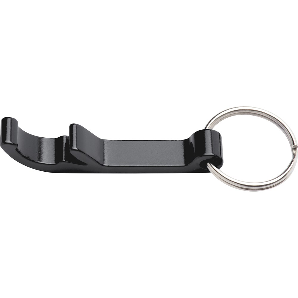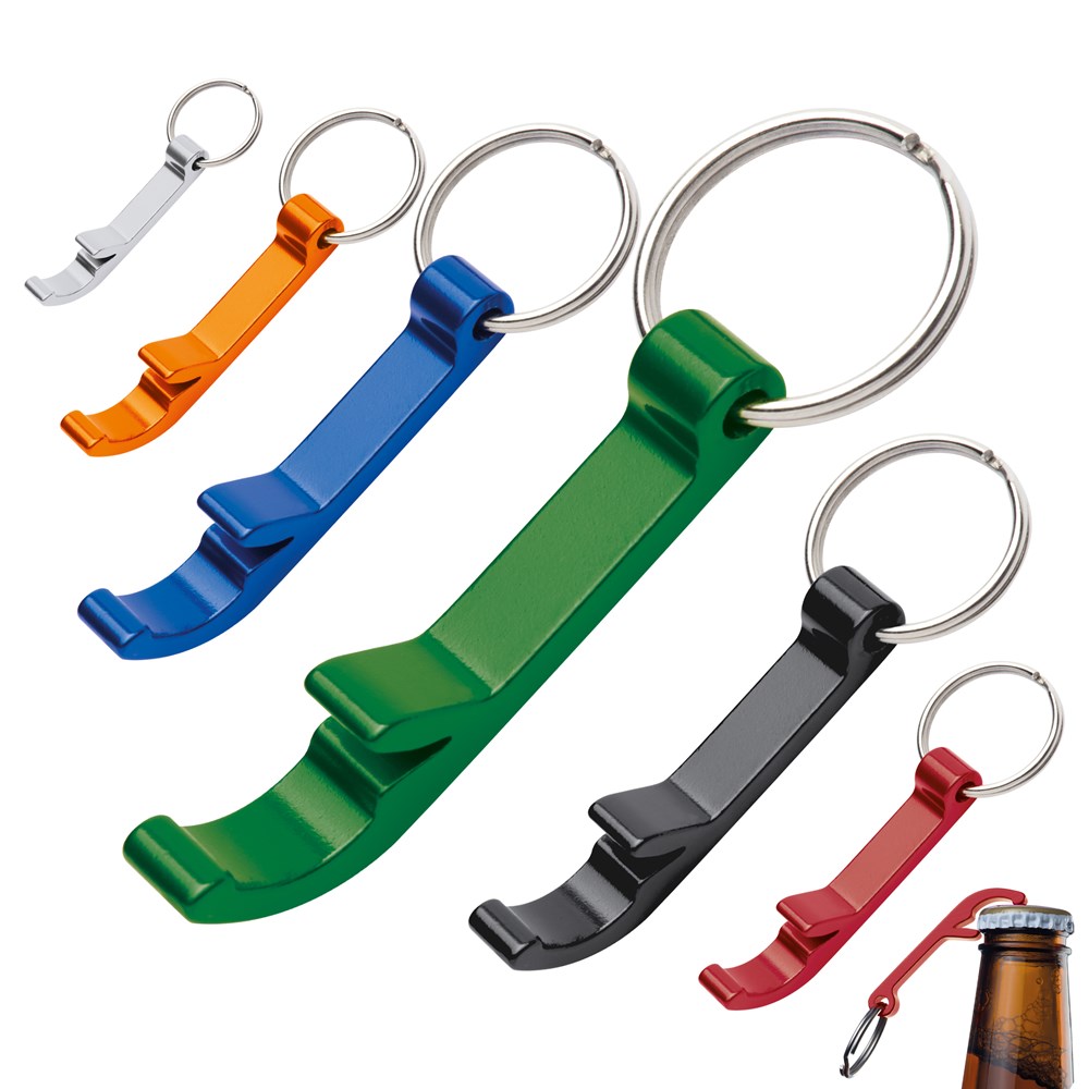 Flaschenöffner aus Metall mit Schlüsselring. Ihre Werbung bringen wir mittels einer Lasergravur mittig an.