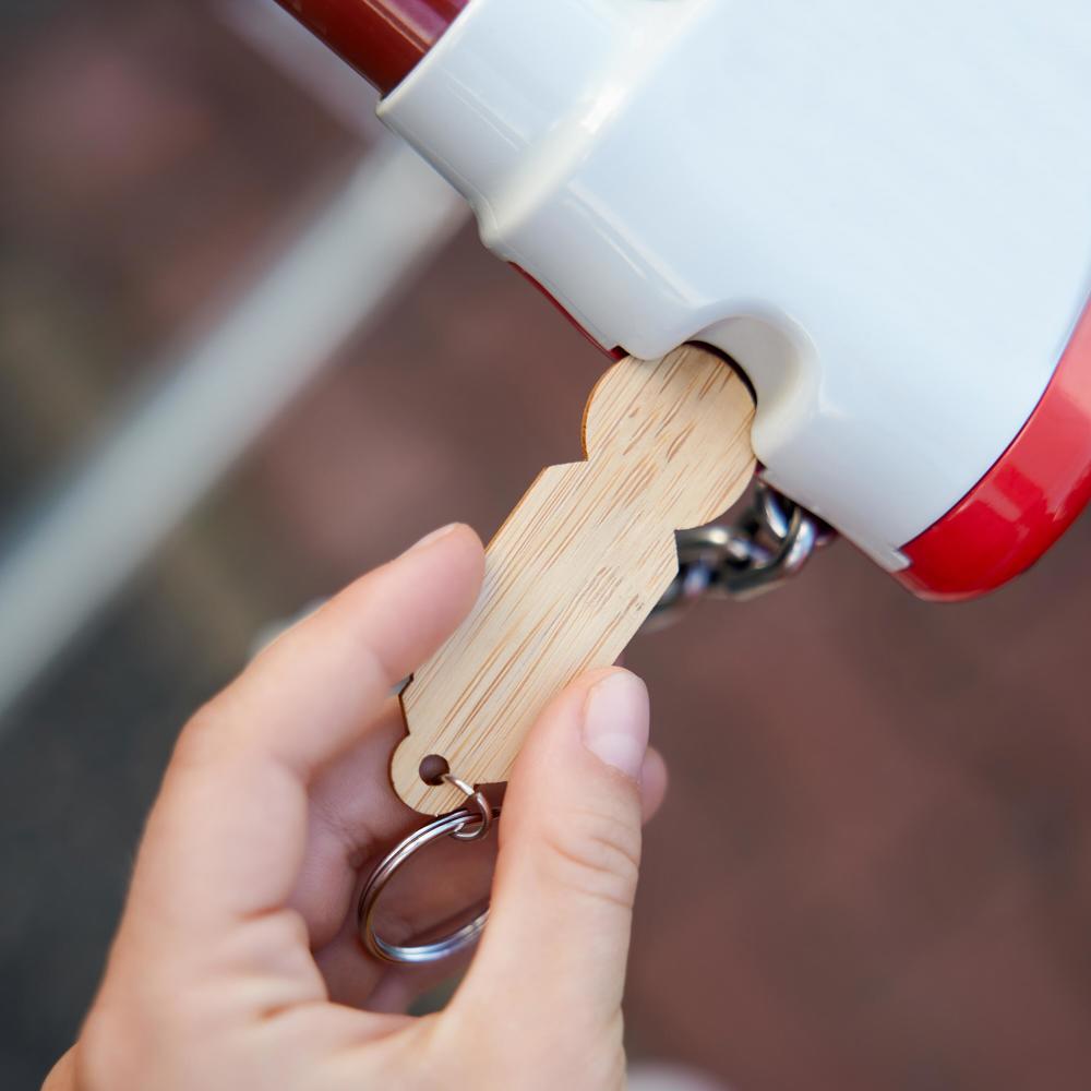 Der nachhaltige Einkaufswagenchip aus Bambusholz. Aufgrund seiner durchdachten Form müssen Sie nie wieder nach den passenden Münzen für Ihren Einkaufswagen suchen. Der Einkaufswagenlöser bleibt am Schlüsselbund und kann direkt eingesetzt werden. Inkl. Schlüsselring aus Metall. Bambus ist ein Naturprodukt, dadurch können Schwankungen bei Farbe und Maserung nicht ausgeschlossen werden.