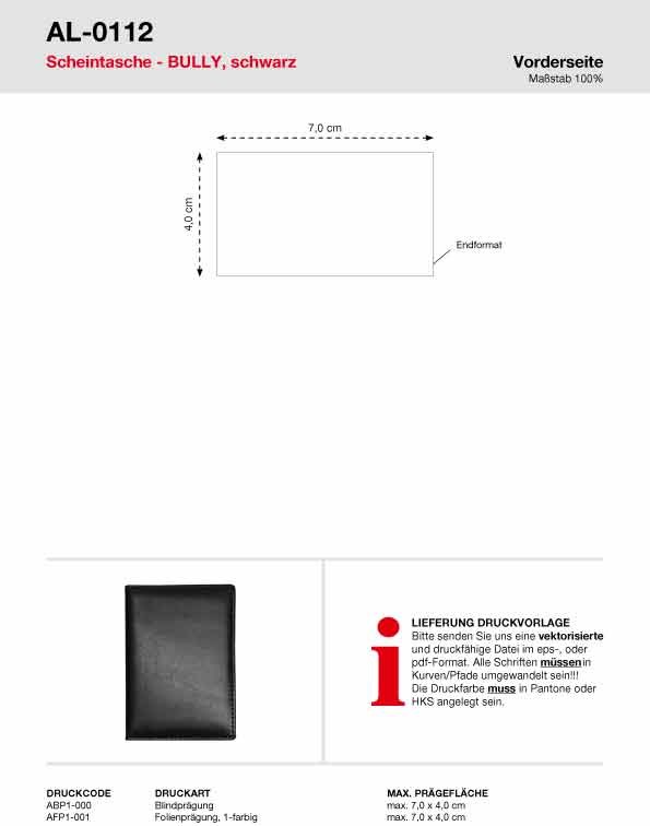 Unsere Scheintasche Bully aus hochwertigem, gleichbleibendem PU-Material in Lederoptik mit Seidenglanz. Innen mit vier transparenten Fächern, davon zwei Kreditkartenfächer. Der Artikel wird per edler Blindprägung oder farbiger Folienprägung mit Ihrem Motiv veredelt.
