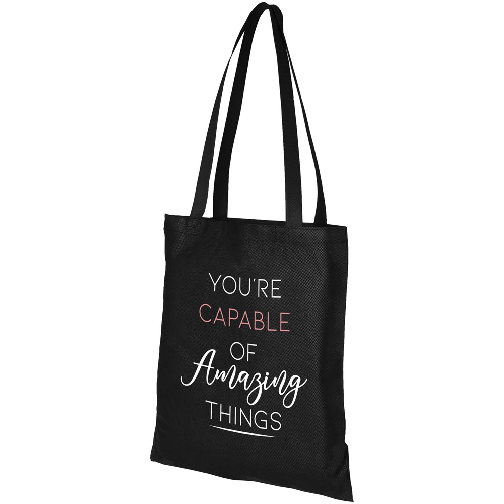 Sie brauchen eine gute Tasche für eine Messe oder Konferenz? Die große Non Woven Tasche Zeus ist die perfekte Wahl. Ihr schlankes Design macht sie zu einem eleganten Modell, das sich für den Transport von leichten Gegenständen wie einem Notebook und einem Stift eignet. Die Henkel sind 29 cm lang und können daher leicht über der Schulter getragen werden. Belastbar bis zu 5 kg.