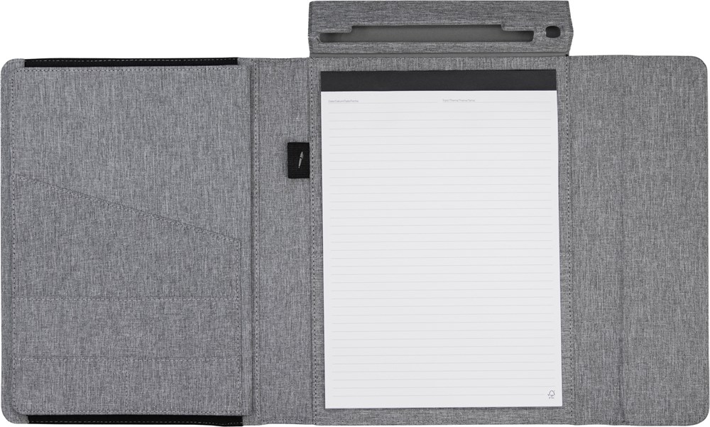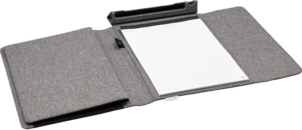 Die Noty Folio Mappe, die aus recycelten PET-Flaschen und Papier hergestellt wird, ist eine hochwertige Mappe für vielbeschäftigte, gut organisierte Geschäftsleute. Sie bietet Platz für einen A4-Notizblock, ein Tablet-/Laptopfach (bis zu 13") und Fächer für wichtige Dinge wie Visitenkarten. Diese umfassende Mappe hat einen Magnetverschluss, einen festen Einband und einen ausklappbaren Schreibtisch-Organizer. Ideal für Vielfahrer und Berufstätige, die viel unterwegs sind.
