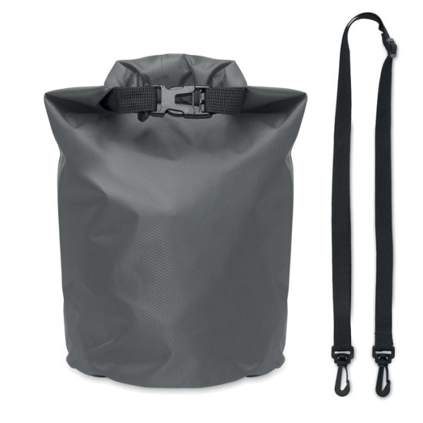 Wasserfester Beutel (IPX6) aus 210T RPET Ripstop. Rollschließmechanismus mit Steckverschluss und Schultergurt. Füllmenge: 5L.