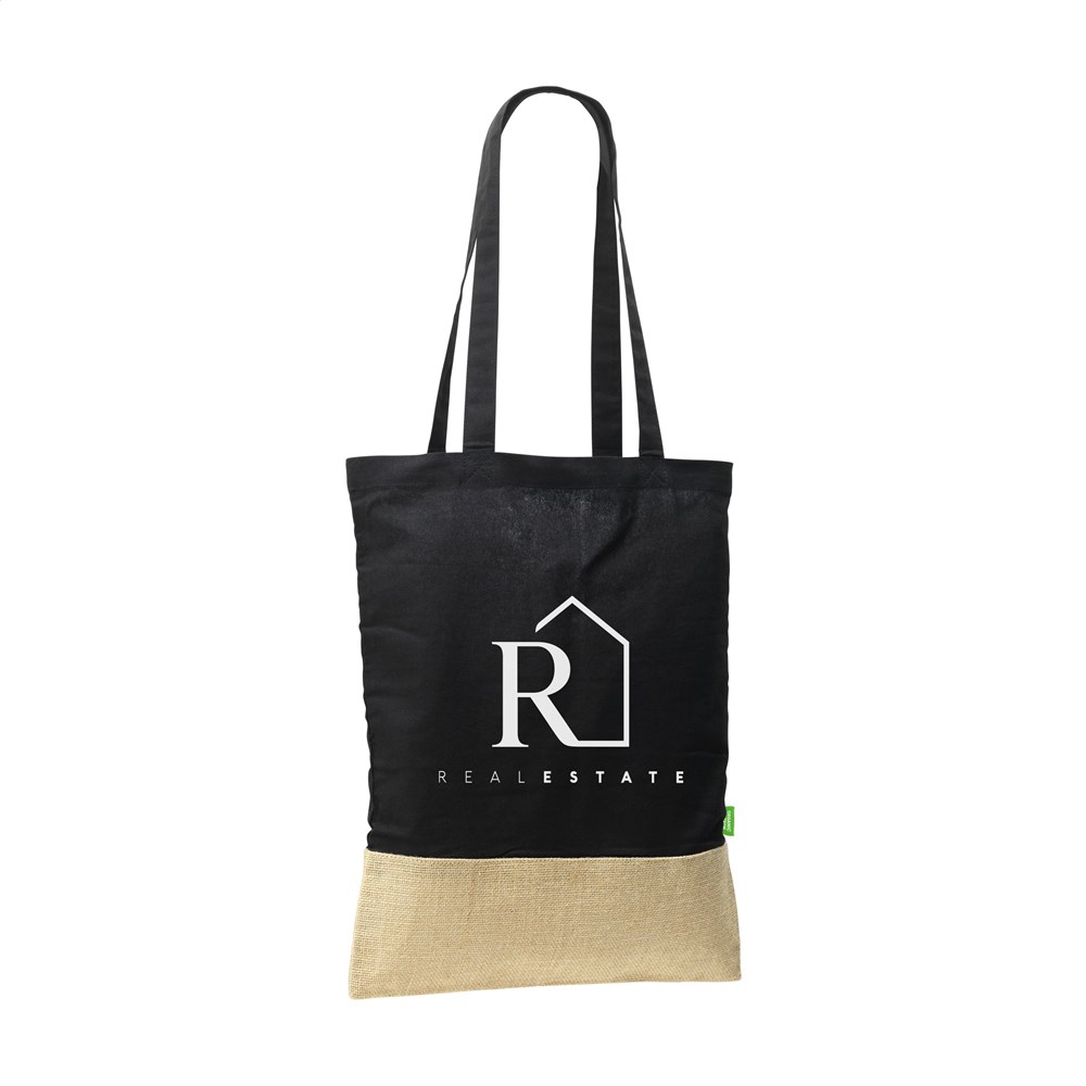 Robuste Einkaufstasche aus 100% Bio-Baumwolle (160 g/m²) kombiniert mit stabiler Jute. Mit langen Griffen. Fassungsvermögen ca. 8 Liter.