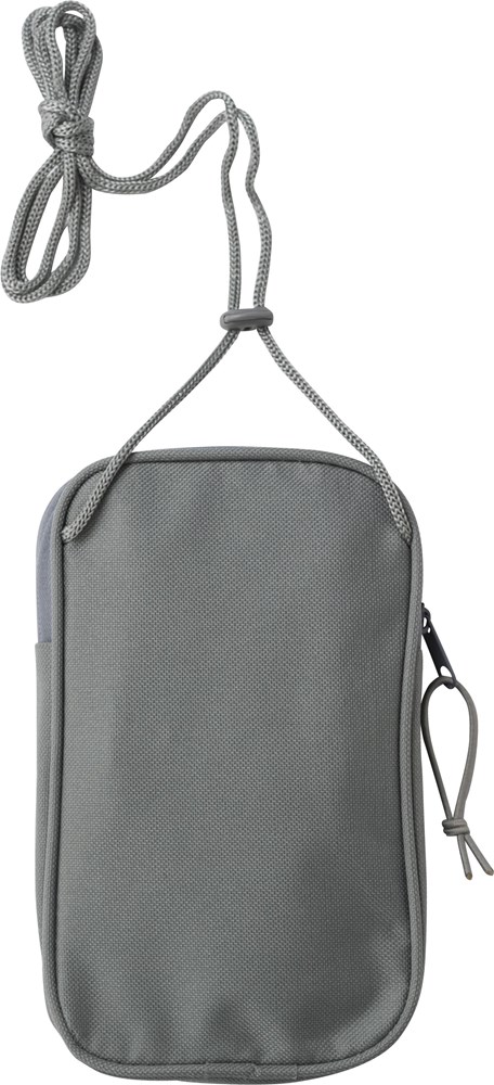RPET 600D Tasche mit einem Reißverschlussfach und einer offenen Fronttasche. Mit verstellbarer Kordel am Handgelenk. Zum Tragen um den Hals oder diagonal. Mit RPET-Etikett.