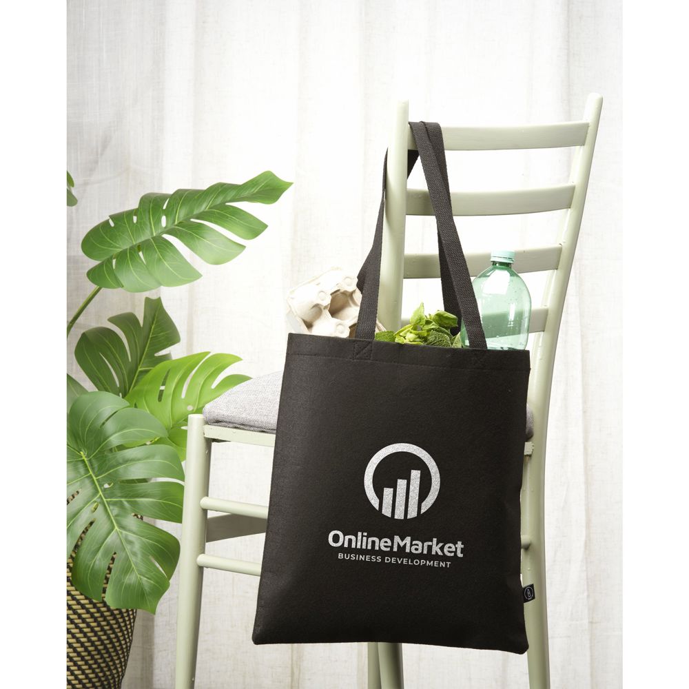 Robuster Shopper aus dickem RPET Qualitätsfilz mit langen, gewebten Baumwollgriffen. GRS-zertifiziert. Gesamtes recyceltes Material: 75%. Fassungsvermögen ca. 11 Liter.