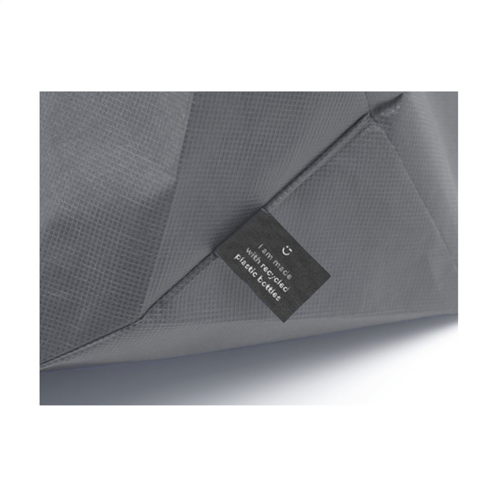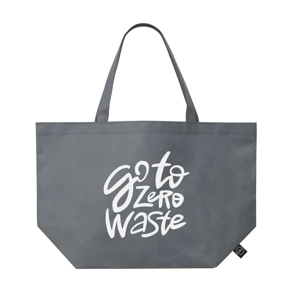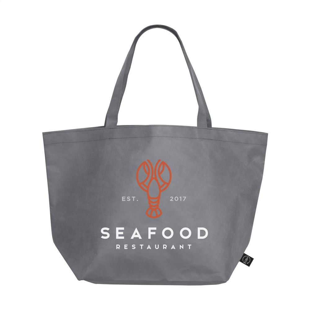 Großzügige RPET-Vlies-Einkaufs- und Strandtasche (80 g/m²), hergestellt aus recycelten PET-Flaschen. Eine breite Tasche, sowohl stark als auch leicht, mit langen Griffen. GRS-zertifiziert. Recyceltes Material insgesamt: 98%. Fassungsvermögen ca. 25 Liter.
