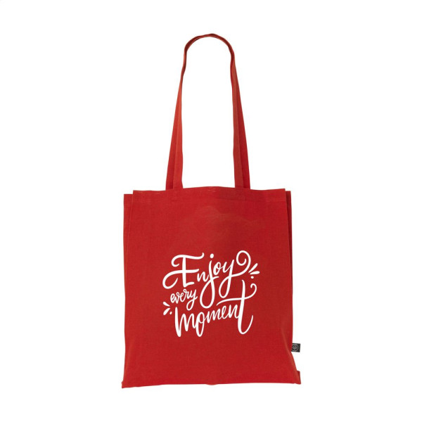 Robuste Einkaufstasche mit langen Griffen, aus 80% recyceltem Baumwoll-Segeltuch und 20% recyceltem Polyester (150 g/m²). GRS-zertifiziert. Recyceltes Material insgesamt: 100%. Fassungsvermögen ca. 12 Liter.