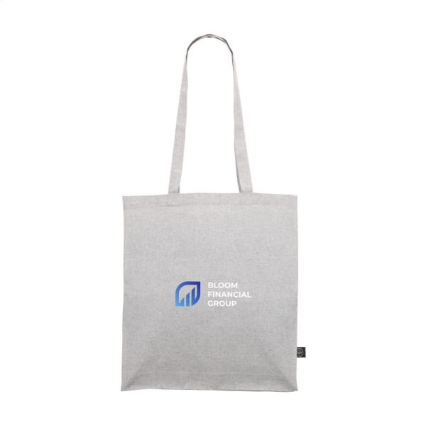 Robuste Einkaufstasche mit langen Griffen, aus 80% recyceltem Baumwoll-Segeltuch und 20% recyceltem Polyester (150 g/m²). GRS-zertifiziert. Recyceltes Material insgesamt: 100%. Fassungsvermögen ca. 12 Liter.