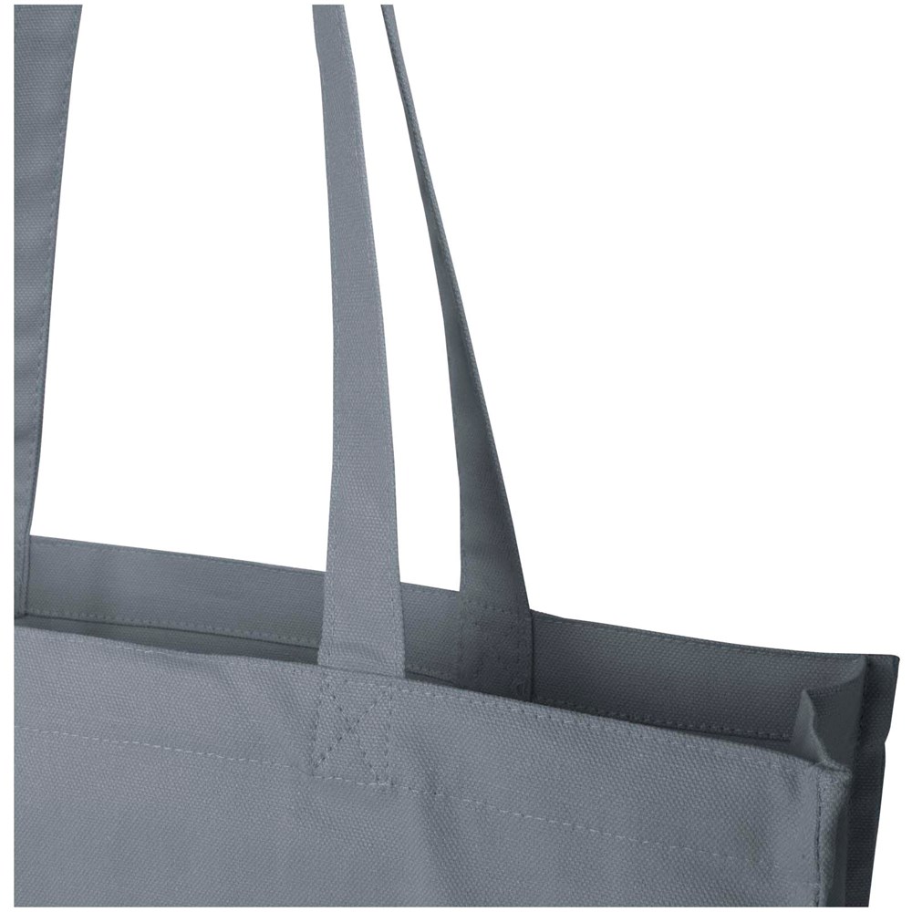 Die Florida Tragetasche mit Seitenfalten wird aus 100 % GRS-zertifizierter, Recyclingbaumwolle mit einem Gewicht von 270 g/m² hergestellt und ist eine verantwortungsbewusste und nachhaltige Wahl für den täglichen Bedarf. Mit einem Fassungsvermögen von bis zu 14 Litern und 30 cm langen Griffen ist sie ideal für den mühelosen Transport von Lebensmitteln, Büchern oder Alltagsgegenständen.