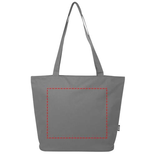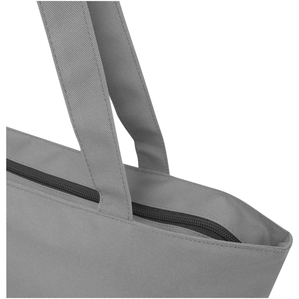 Die Panama GRS-recycelte Tragetasche mit Reißverschluss aus wasserabweisendem 600D RPET ist eine perfekte Mehrzwecktasche für den Besuch einer Veranstaltung, für den Strand oder für den Lebensmitteleinkauf. Sie verfügt über ein Hauptfach mit Reißverschluss und eine Innentasche mit Reißverschluss, die groß genug ist, um Ihr Telefon und andere wertvolle Gegenstände zu verstauen. Die Griffe sind 34 cm lang, sodass die Tasche leicht über der Schulter getragen werden kann. Belastbarkeit bis zu 10 kg. PVC frei.