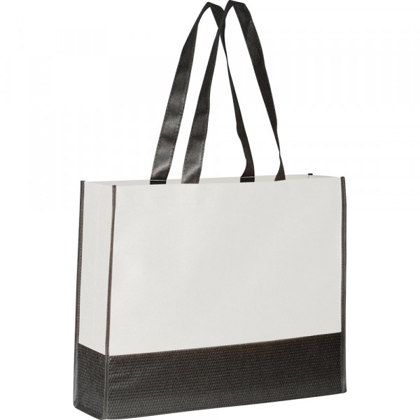 Non Woven Einkaufstasche (Grammatur 80 g/m²) in vielen Farben mit schwarzem Boden und Tragehenkeln. Ihre Werbung wird vorne auf die Tasche gedruckt. Für 2C oder mehr, Preise auf Anfrage.