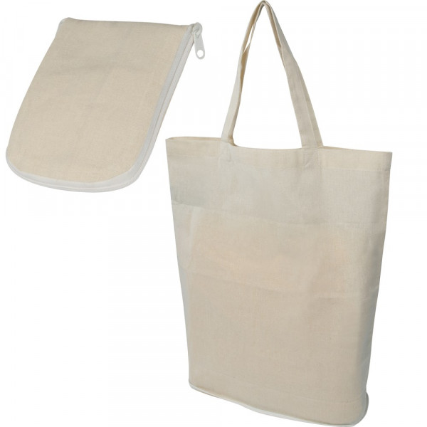 Oeko-Tex® STANDARD 100 zertifizierte, naturfarbene, faltbare Baumwolltasche (Grammatur 140 g/m²) mit Tragehenkeln. Der Werbeaufdruck erfolgt auf einer Seite der Tasche im offenen Zustand.