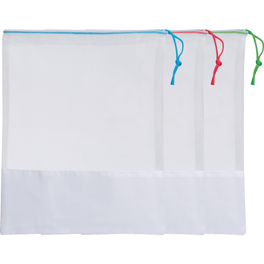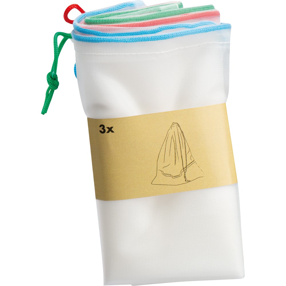 Perfekter nachhaltiger Einkaufsbegleiter nicht nur für Obst und Gemüse. Das 3er-Set besteht aus PET (Netzteil) sowie im unteren Drittel aus 210D Polyester. Ihre Werbung drucken wir im unteren Drittel auf den Polyesterpart auf den Beutel mit dem blauen Band. Für 2C oder mehr, Preise auf Anfrage.