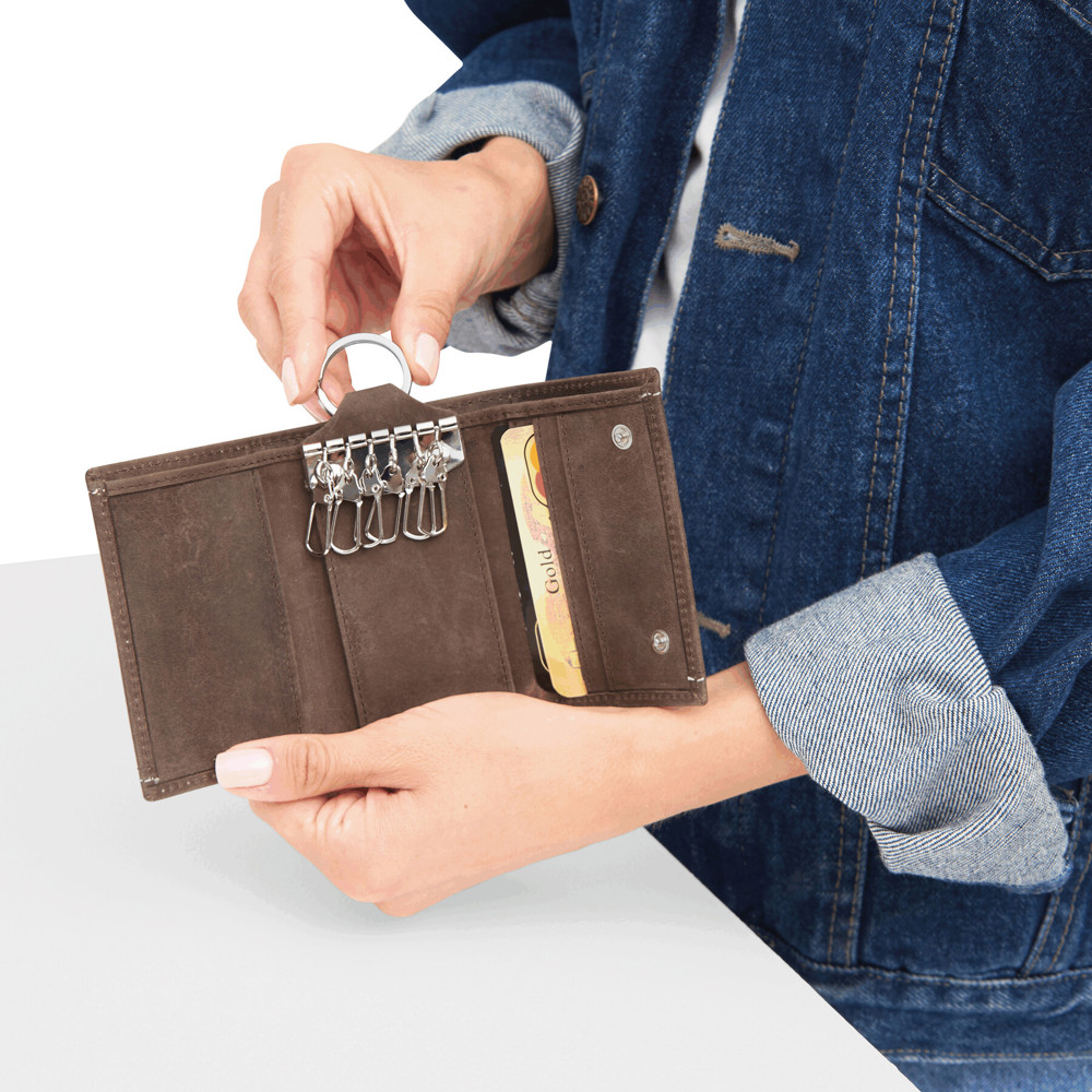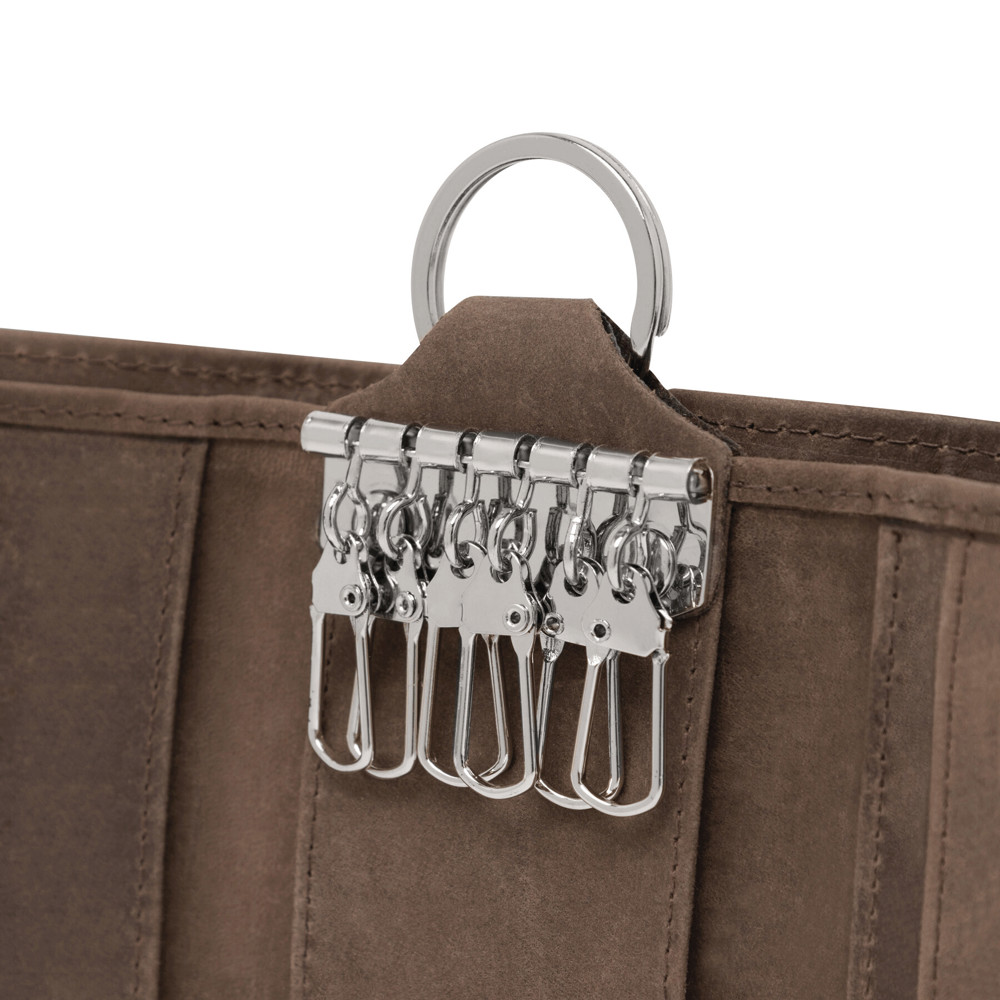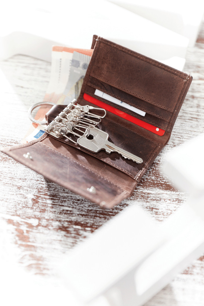 Echtleder-Schlüsseletui WILD STYLE III: mit 2 Druckknöpfen zum Verschließen, 1 großer Schlüsselring, innen 6 kleine Schlüsselhaken, 4 Einsteckfächer für Geldkarten, 1 Geldscheinfach, außen dekorative Ziernähte, in Box