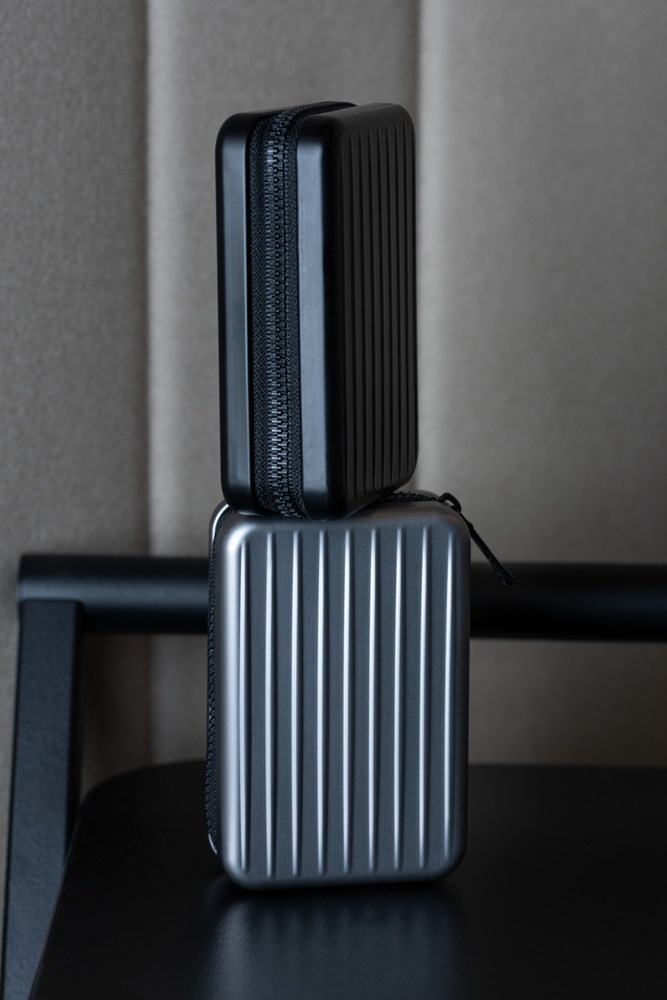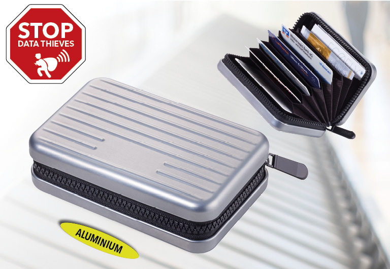 Kreditkartenetui im Stil eines Hartschalenkoffers, Reißverschluss, mit Ausleseschutz (für RFID Chips), 9 Fächer mit Platz für ca. 20 Karten, Geld und Belege, Aluminium, Polyester, matt, titanfarben