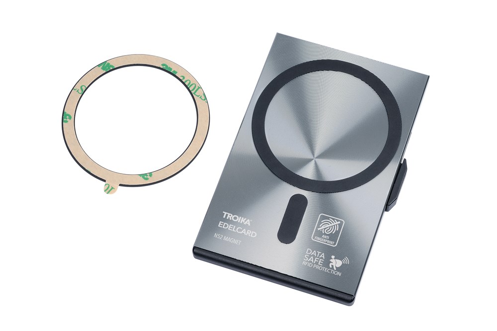 Kartenetui MagSafe, Etui für bis zu drei Karten (Führerschein, Ausweis, Kreditkarte), mit Schiebemechanismus, Magnet (N52) auf der Rückseite zum Befestigen am iPhone, zusätzlicher selbstklebender MagSafe Metallring mit 3M Klebefläche zur individuellen Befestigung, z.B. an allen gängigen Smartphones, Hüllen, Notizbüchern, etc., RFID Schutz (Auslesesicherheit), Aluminium, Diamantschliff, titanfarben