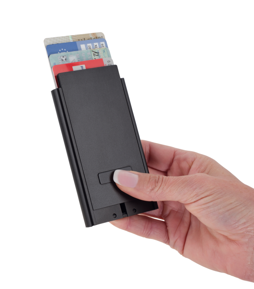 Kartenetui MagSafe, Etui für bis zu sechs Karten (Führerschein, Ausweis, Kreditkarte, usw.), geheimer Schiebemechanismus auf der Front, RFID Schutz (Ausleseschutz), starker Magnet (N52) auf der Rückseite zum Befestigen am Handy, zusätzlicher selbstklebender MagSafe Metallring mit 3M Klebefläche zur individuellen Befestigung, z.B. an allen gängigen Smartphones, Hüllen, Notizbüchern, etc., Aluminium, schwarz