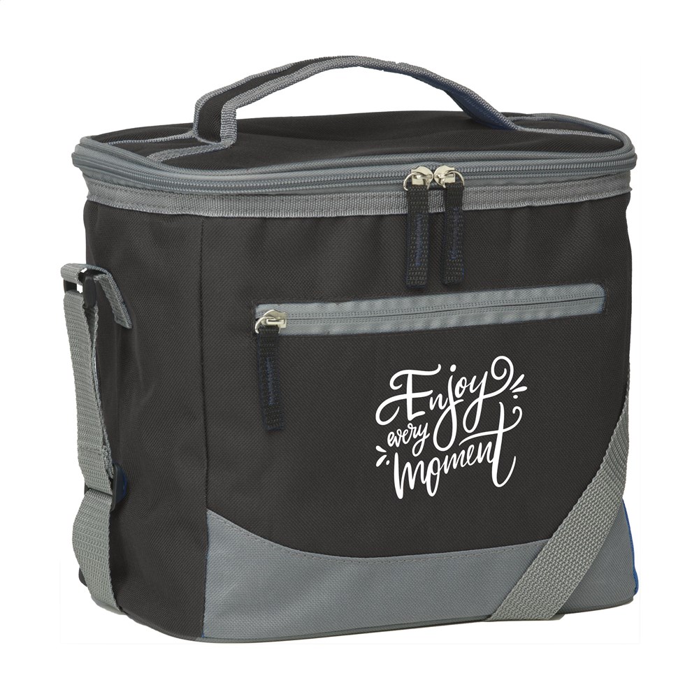 Kühltasche im praktischen Format. Aus 600D Polyester. Mit großem Kühlfach,Fronttasche mit Reissverschluss, Griff und anpassbarem Schultergurt. Passend für 12 Getränkedosen. Fassungsvermögen ca. 10 Liter.