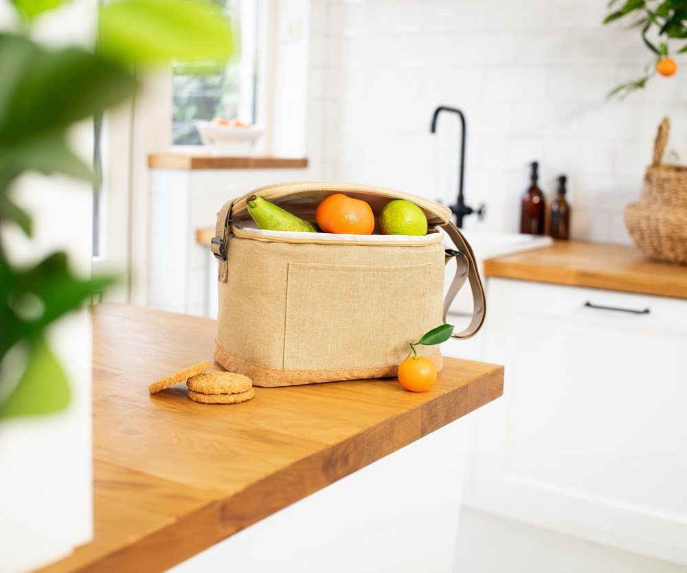 Kühltasche aus rPET-Polyester (600D). Boden aus Kork. PEVA-Innenseite. Kleine Tasche auf der Vorderseite. Verstellbarer Gurt. Mit rPET-Etikett.