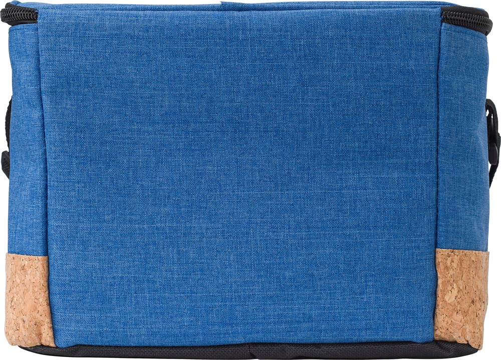 Kühltasche aus Polyester (600D) mit Reißverschluss und einem Boden aus Kork. Innenmaterial ist EVA. Die Tasche fasst sechs Dosen mit 0,5 Litern Inhalt.