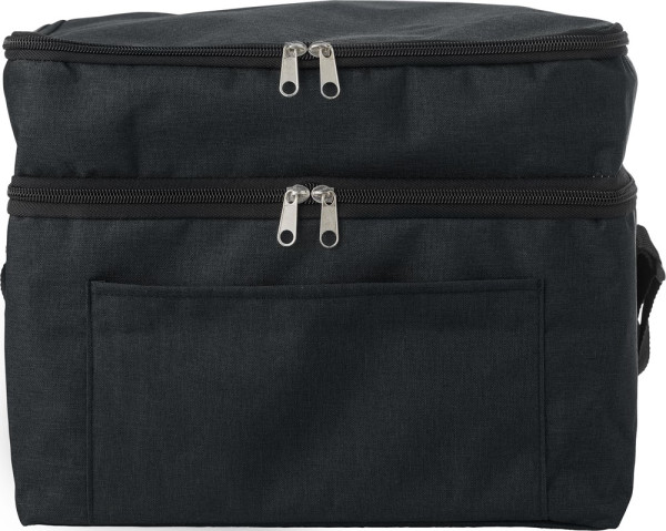 rPET-Kühltasche mit Aluminiumfolie innen. Zwei Fächer mit Reißverschluss. Inklusive Tragegurt.