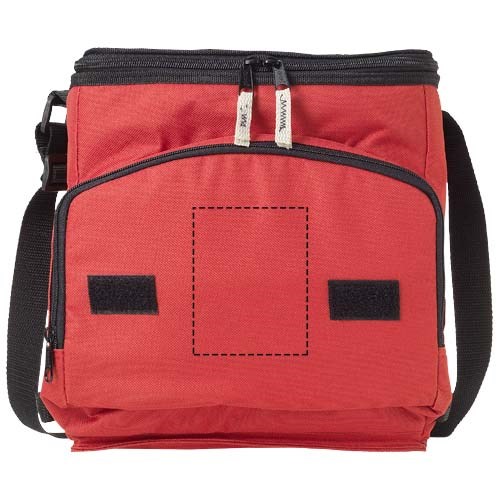 Zusammenfaltbare Kühltasche mit Hauptfach mit Reißverschluss und Fronttasche mit Reißverschluss. Verstellbarer Schulterriemen. Die Kühltasche kann dank des Klettverschlusses an der Fronttasche flach zusammengefaltet werden.