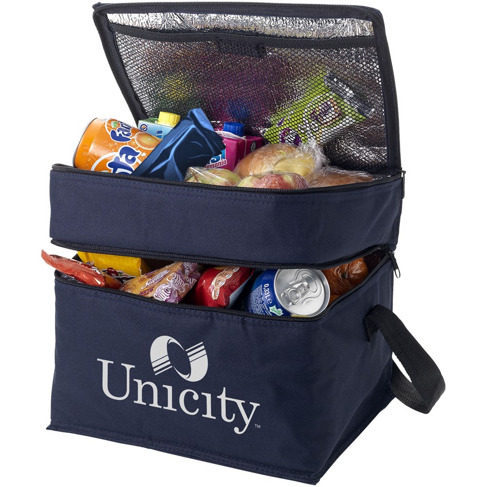 Mit der Oslo-Kühltasche haben Sie jederzeit und überall gekühlte Getränke und Snacks dabei. Die Kühltasche hat zwei separate Fächer mit Reißverschluss. Das obere Fach eignet sich perfekt für kleine Snacks, während das untere Fach ideal für größere Lebensmittel ist. Der Schultergurt ist verstellbar, so dass die Tasche von jedem leicht zu tragen ist. Die Kühltasche besteht aus 600D Polyester, einem strapazierfähigen und langlebigen Material.