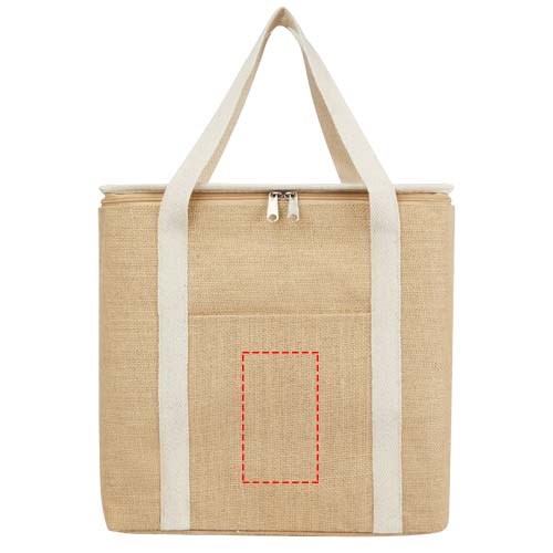 Die große Juta Kühltasche ist aus robuster und verschleißfester laminierter Jute gefertigt. Verfügt über ein großes Hauptfach (19 Liter) mit Platz für sechs 1,5-Liter-Flaschen, das mit extra dicker und lebensmittelechter Aluminiumisolierung ausgestattet ist, damit Getränke, Erfrischungen und Tiefkühlprodukte stundenlang kühl und von äußeren Einflüssen abgeschirmt bleiben. Die Tasche hat einen Reißverschluss an der Oberseite, eine Fronttasche und 2 gewebte Baumwolltragegriffe (50 × 2,5 cm). Hergestellt in Indien und OEKO-TEX® zertifiziert.