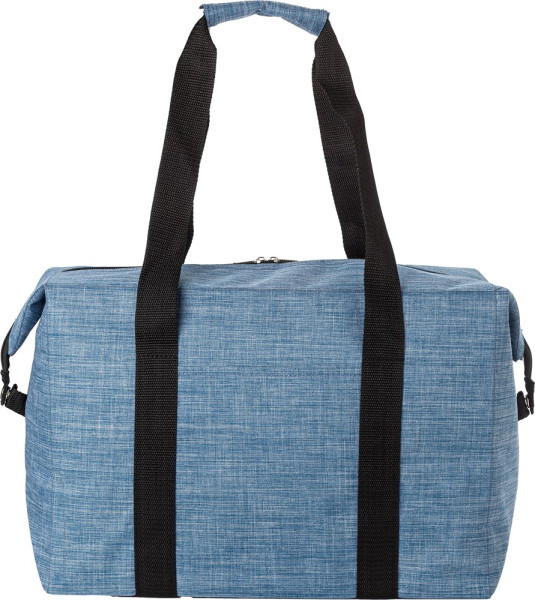 Kühltasche aus 600D-Polyester. Ein großes Fach und eine kleine Tasche auf der Vorderseite. Zwei kurze Trageriemen mit Klettverschluss. Innen ist die Tasche mit Schaumstoff und Aluminium isoliert.