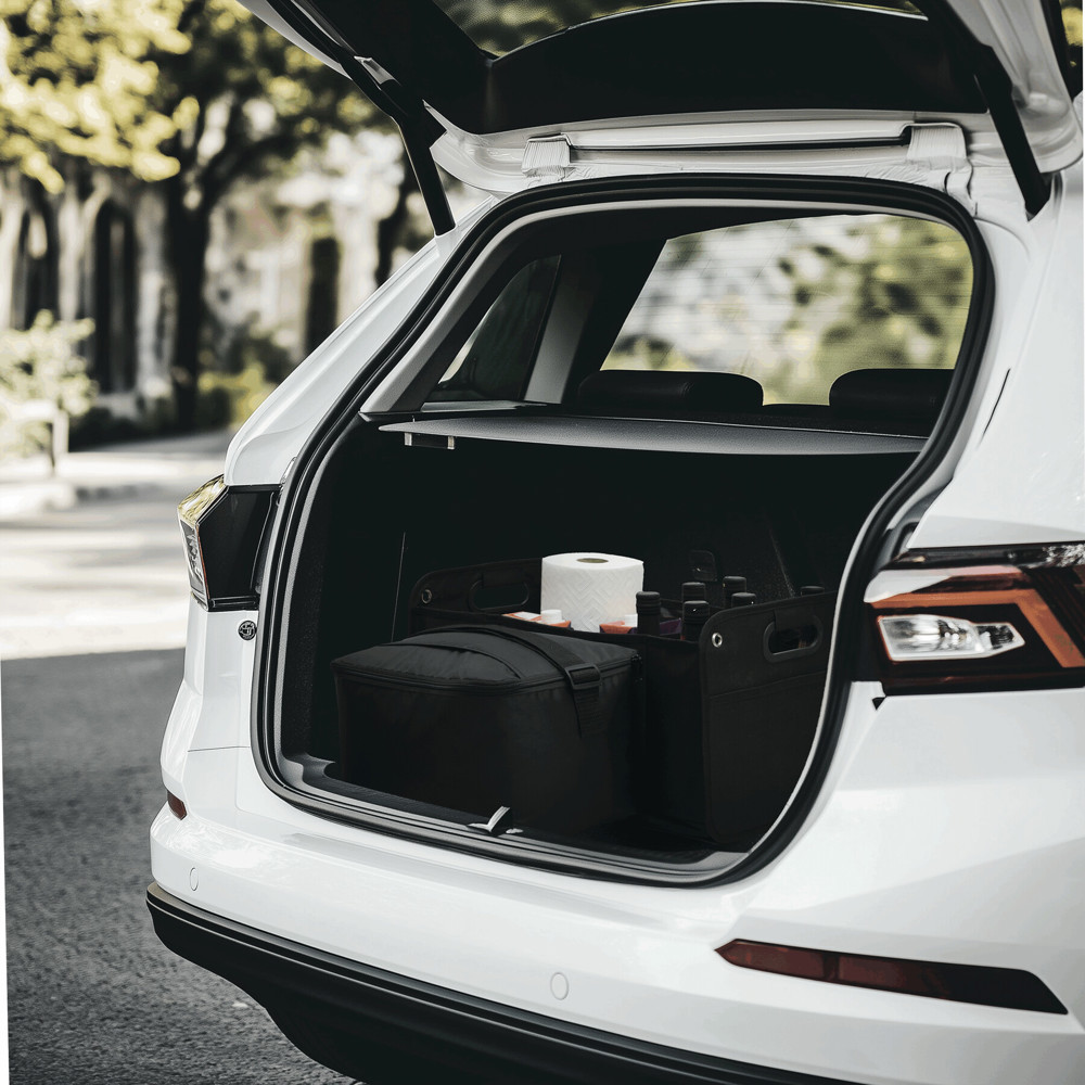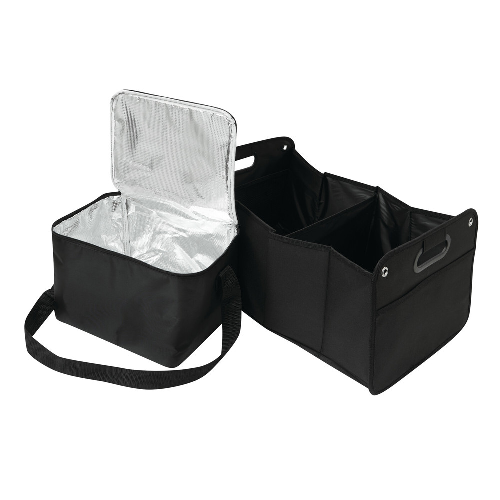 Kofferraumtaschen-Set ISO-GADGET, 2-teilig: bestehend aus 1.) separat entnehmbare Kühltasche mit verstellbarem Schultergurt und Einsteckfach auf dem Deckel, 2.) große faltbare Tasche mit 2 Fächern und Einlegeboden für viel Stauraum, sowie ein Netzeinsteckfach, 2 integrierte Tragegriffe, mit Klettverschluss am Boden für besten Halt im Kofferraum sowie 4 Metall-Befestigungsösen – bei Nichtgebrauch durch elastischen Gurt platzsparend faltbar – beide Taschen sind auch unabhängig voneinander nutzbar, die Kühltasche lässt sich passgenau in der Kofferraumtasche verstauen