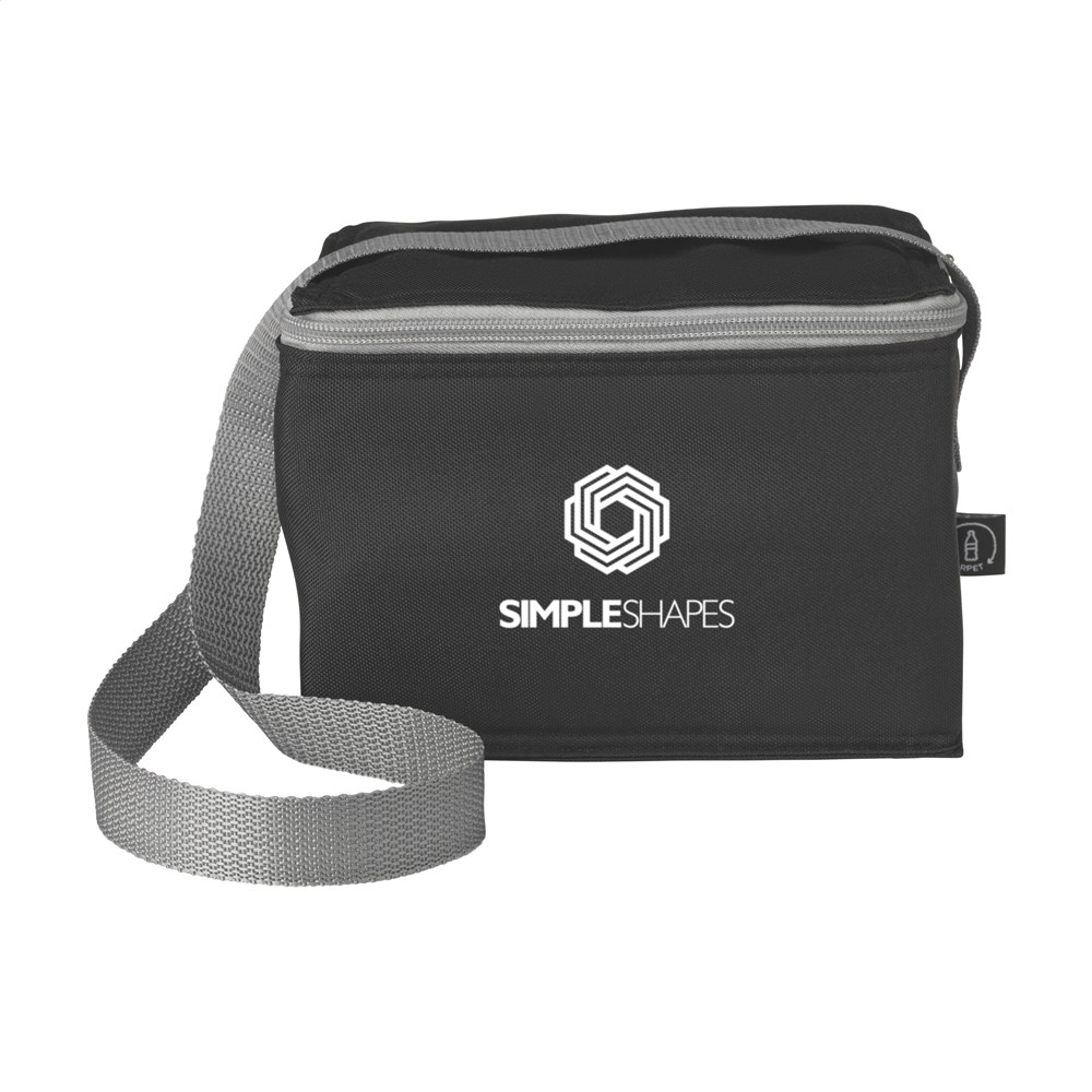 Kühltasche aus 600D-RPET-Polyester-Kühltasche. Geeignet für 6 Getränkedosen. Mit Trageriemen. GRS-zertifiziert. Recyceltes Material insgesamt: 51%. Fassungsvermögen ca. 3 Liter.