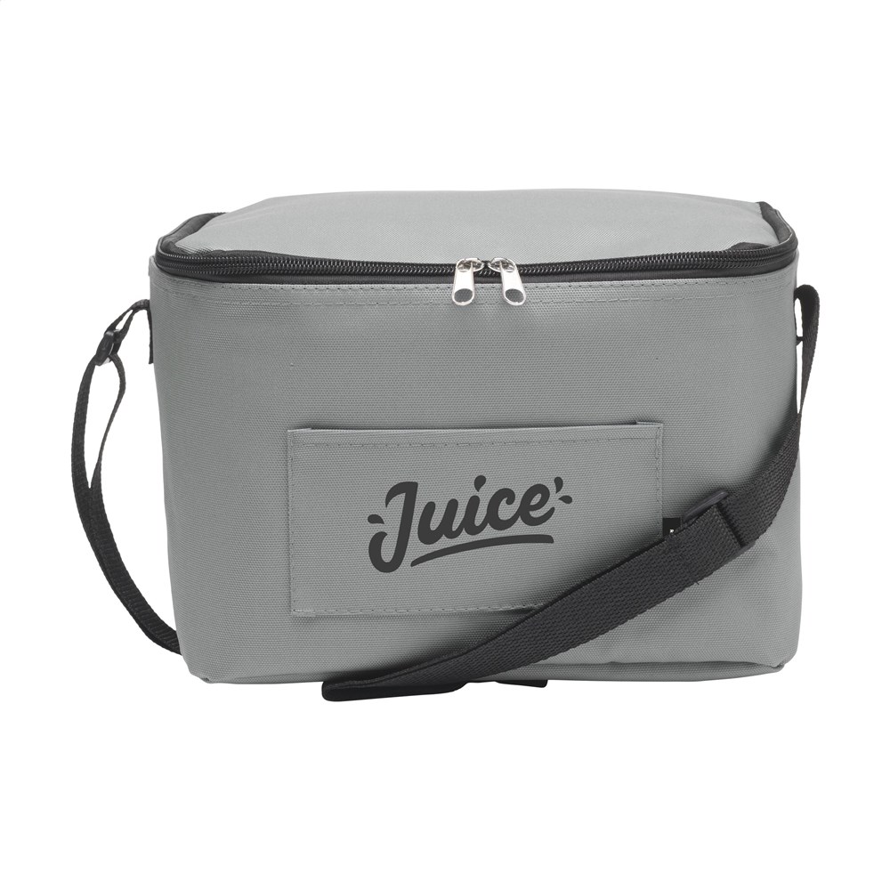 Kühltasche aus 600D-RPET-Polyester. Auskleidung aus 100% PEVA. Mit Einsteckfach auf der Vorderseite und verstellbarem Trageriemen aus Polyester. GRS-zertifiziert. Gesamtes recyceltes Material: 51%. Fassungsvermögen ca. 7,5 Liter.