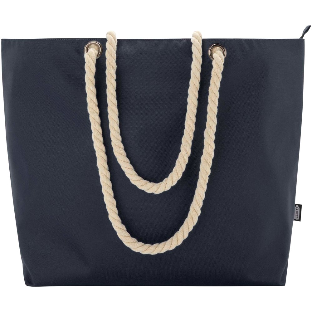 Die Panama Kühltragetasche besteht aus GRS-zertifiziertem Recycling-Polyester und verfügt über ein großes Hauptfach mit Reißverschluss sowie hochwertige Tragegriffe aus Alufolie und Baumwollkordel. Geeignet für verschiedene Aktivitäten wie Einkaufen, einen Tag am Strand oder im Park. Fassungsvermögen: 23 Liter. Beständigkeit bis zu 10 kg. PVC frei.