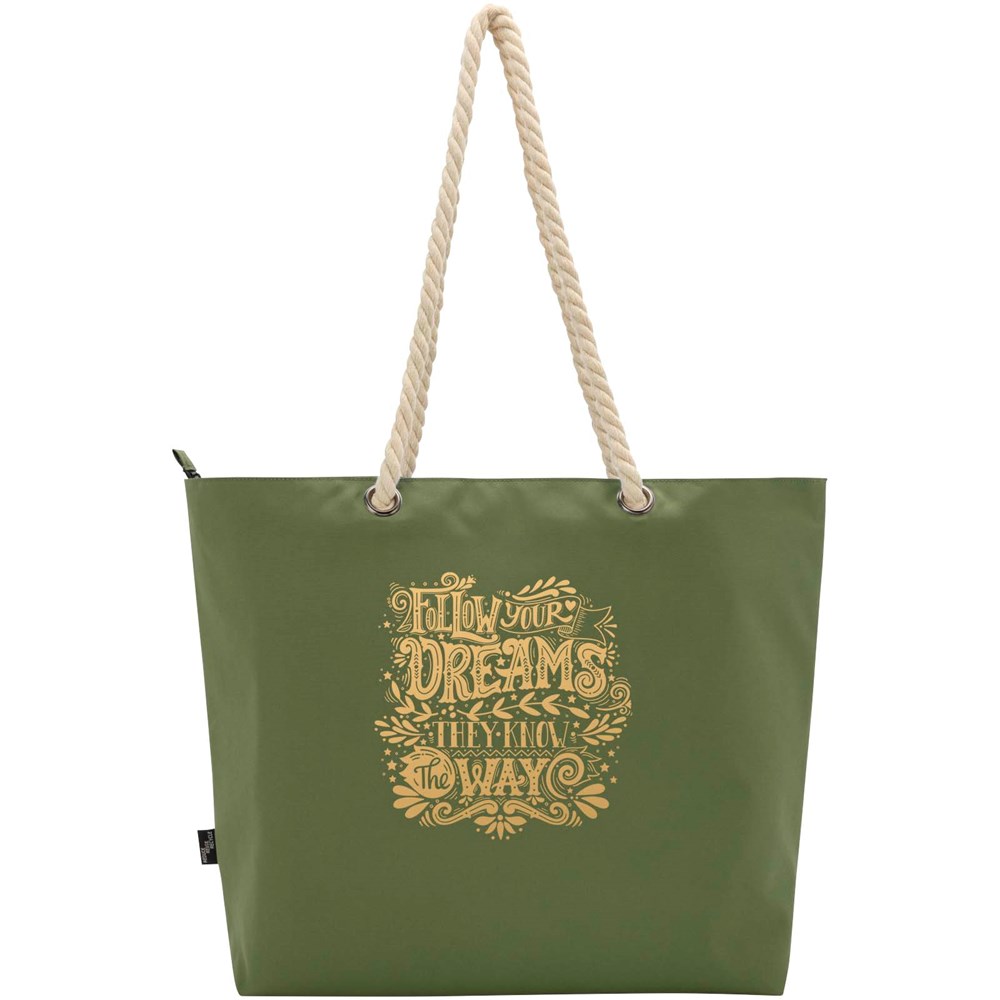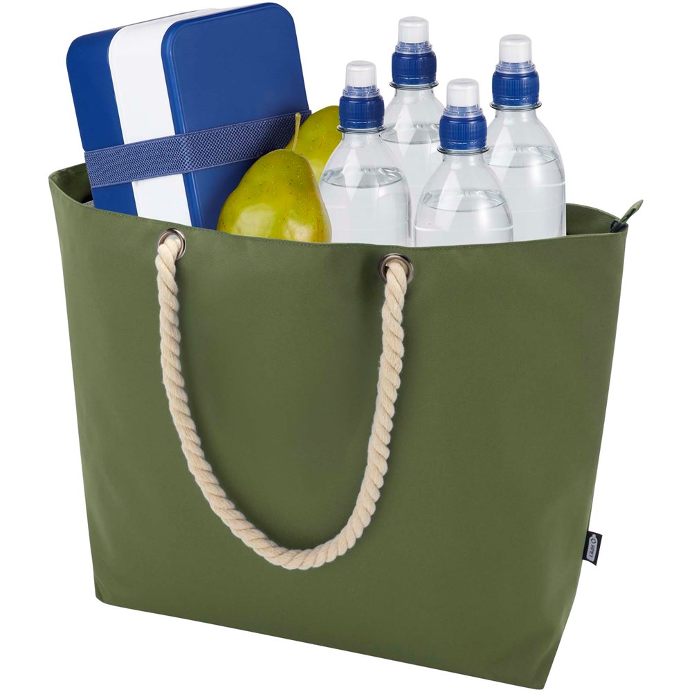 Die Panama Kühltragetasche besteht aus GRS-zertifiziertem Recycling-Polyester und verfügt über ein großes Hauptfach mit Reißverschluss sowie hochwertige Tragegriffe aus Alufolie und Baumwollkordel. Geeignet für verschiedene Aktivitäten wie Einkaufen, einen Tag am Strand oder im Park. Fassungsvermögen: 23 Liter. Beständigkeit bis zu 10 kg. PVC frei.