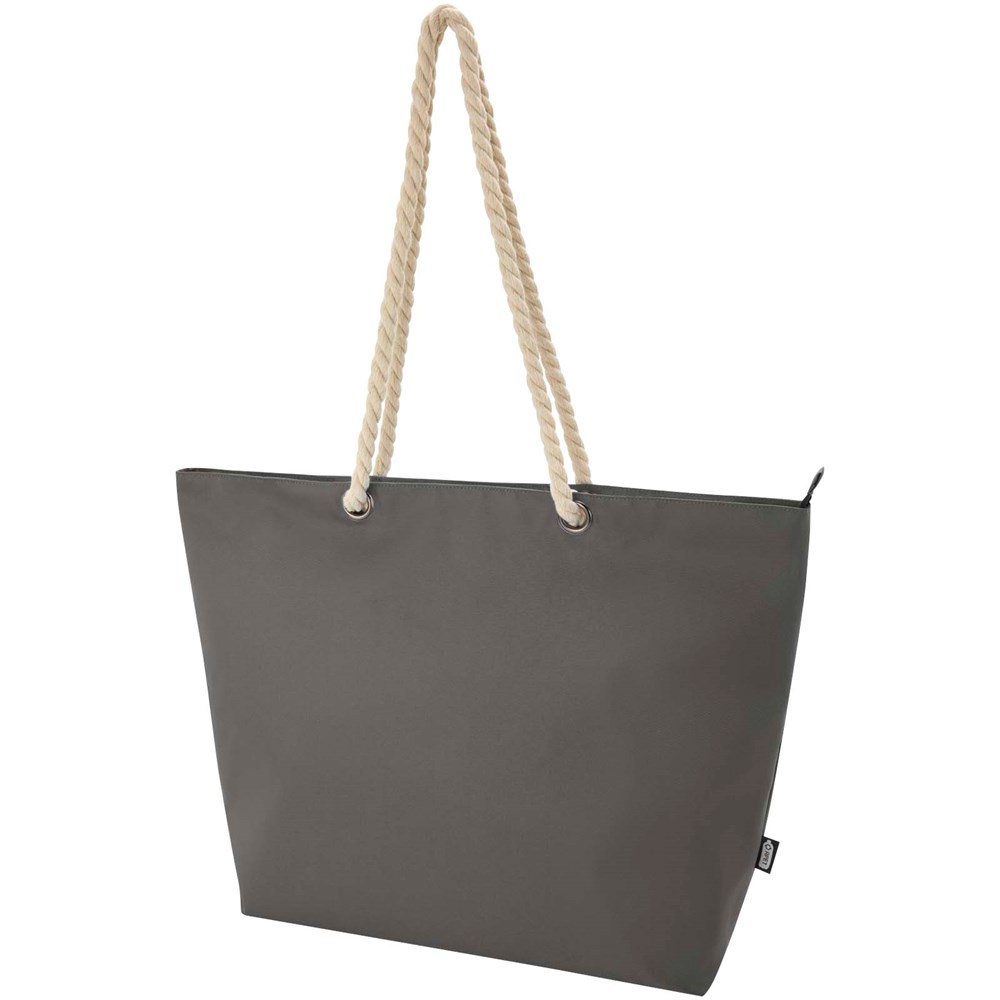 Die Panama Kühltragetasche besteht aus GRS-zertifiziertem Recycling-Polyester und verfügt über ein großes Hauptfach mit Reißverschluss sowie hochwertige Tragegriffe aus Alufolie und Baumwollkordel. Geeignet für verschiedene Aktivitäten wie Einkaufen, einen Tag am Strand oder im Park. Fassungsvermögen: 23 Liter. Beständigkeit bis zu 10 kg. PVC frei.
