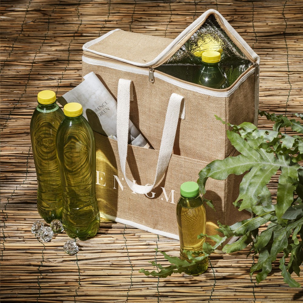 Diese strapazierfähige Kühltasche besteht aus einem robusten Jute- und Baumwollmischgewebe und besitzt eine isolierte Innenseite. In dieser sehr geräumigen Kühltasche können Sie Ihre Speisen und Getränke bei einem Ausflug kühl halten. Diese Tasche hat einen Reißverschluss und eine Tasche an der Vorderseite für zusätzlichen Stauraum. Die zusätzlichen Taschen sind praktisch, um Dinge zu verstauen, die nicht gekühlt werden müssen, wie zum Beispiel Ihr Handy oder Ihre Brieftasche. Wird mit gewebten Henkeln aus Baumwolle geliefert. Fassungsvermögen ca. 24 Liter.