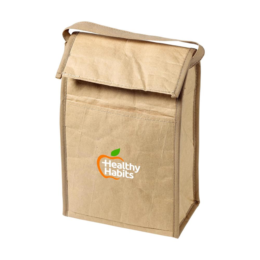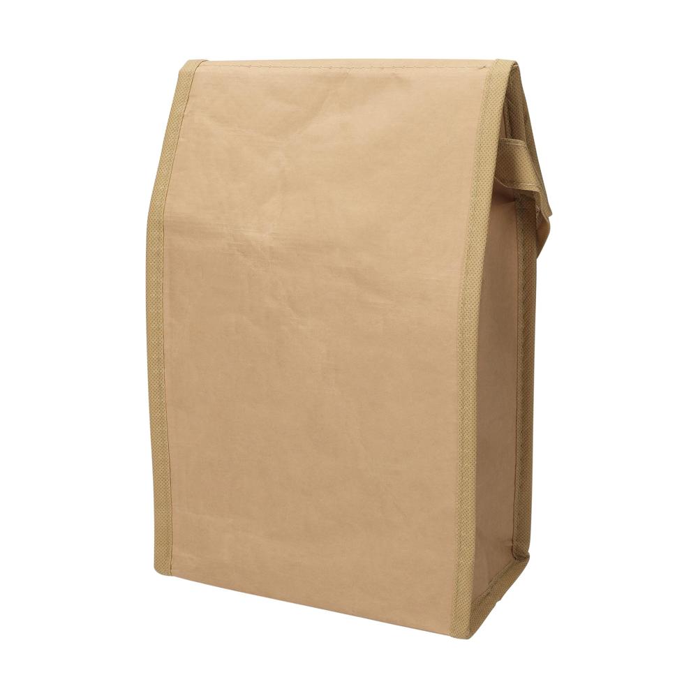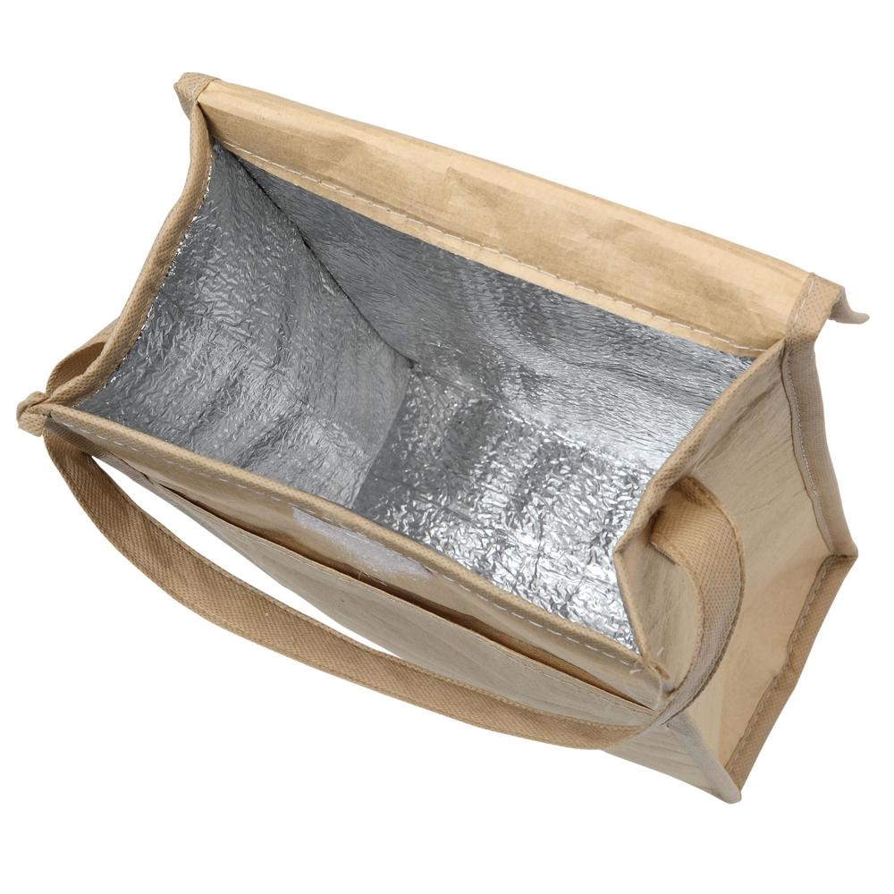 Eine Papiertasche mit Überraschungseffekt. Außen ist die Tasche aus Kraftpapier gefertigt und hat vorne ein zusätzliches Einsteckfach. Das Hauptfach ist mit 2 mm starker, isolierender Aluminiumfolie ausgekleidet, was den Transport von temperaturempfindlichen Lebensmitteln ermöglicht. Mit praktischem Henkel und Überschlagdeckel mit Klettverschluss sowie farblich passendem Piping.