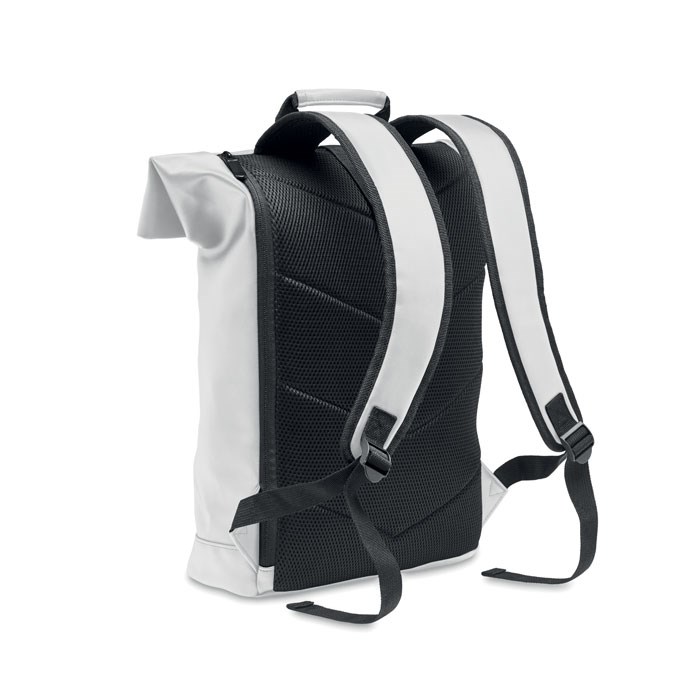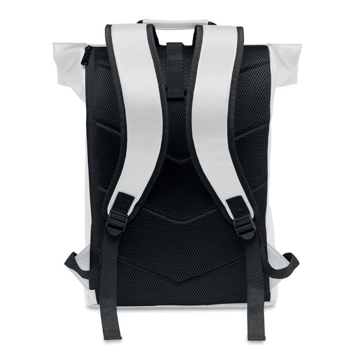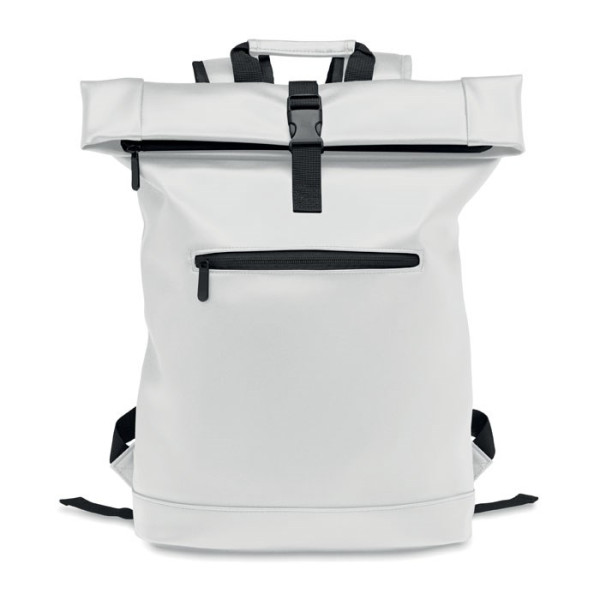 Rucksack mit Rollverschluss aus weichem PU. 15'''' Laptop Fach. Große Fronttasche mit Reißverschluss. Futter aus 210D RPET. Gepolsterter Rücken und verstärkter Boden.