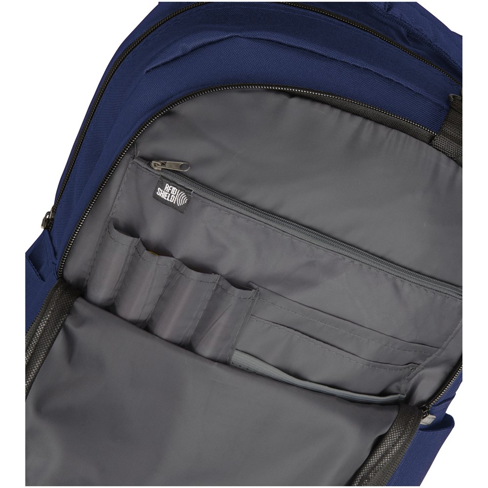 Eleganter, moderner 15" Laptoprucksack bietet eine große Tasche auf der Vorderseite mit Reißverschluss, Schlüsselanhänger und versteckte RFID-Block Technologie für Ihre Karten und Reisepass, um vor Identitätsdiebstahl zu schützen. Das große Reißverschluss Haupfach ist für ein 15" Laptop und bietet ein separates gepolstertes Fach für IPad oder Tablet. Der vordere vertikale Reißverschluss soll Ihnen einen schnellen Zugriff auf die Vordertasche geben. 2 zusätzliche Seitentaschen bieten weiteren Stauraum und die verstellbaren, gepolsterten Schultergurte mit Gewebedetails sind bequem und erlauben Ihnen weitere Reiseutensilien anzuclippen. Der Tragegriff und die Trolley Befestigung machen das Reisen einfach. Es kann zu geringfügigen Farbveränderungen des eigentlichen Produkts kommen, die auf die Beschaffenheit der Gewebefarbstoffe, Gewebe und Drucke zurückzuführen sind.
