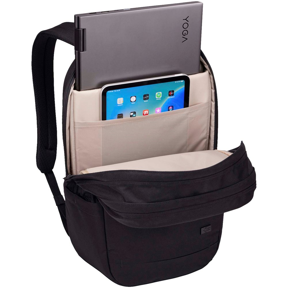 Der Case Logic Invigo 15,6" Laptop-Rucksack ist ein schlichter und raffinierter Rucksack aus recycelten Materialien mit zwei Hauptfächern und durchdachten Organisationselementen. Er besteht aus 100% recyceltem 600D-Polyester und einem 150D-Polyesterfutter. Das gepolsterte Laptop-Fach schützt einen 15,6"-Laptop und die Tablet-Hülle ein 12,9"-Tablet. Im Inneren des Rucksacks befinden sich Steckfächer für kleine Accessoires und eine Netztasche mit Reißverschluss, in der kleine Gegenstände wie Schlüssel sicher verstaut werden können. An der äußeren Rückseite des Rucksacks befindet sich eine versteckte Sicherheitstasche, in der wichtige Gegenstände wie Reisepass oder Brieftasche versteckt und dennoch griffbereit aufbewahrt sind. In der Vordertasche können Sie unterwegs schnell etwas verstauen, und die 2 Seitentaschen eignen sich für Wasserflaschen oder einen Regenschirm. Der Rucksack verfügt außerdem über einen Gepäckgurt, mit dem Sie ihn mühelos an Rollgepäck befestigen können.