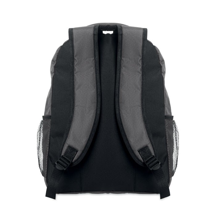 15'' Laptop-Rucksack aus 600D RPET-Polyester mit gepolstertem Laptopfach. Beidseitige Netztaschen und Reißverschlusstasche vorne.