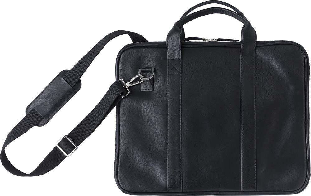 Laptop-Tasche aus Leder (15-Zoll) mit Reißverschluss. Die Tasche hat mehrere Innenfächer: 4 Fächer, ein Fach mit Reißverschluss und Laptopfach mit Klettverschluss. Sie hat zwei kurze Ledergriffe und einen verstellbaren Schultergurt aus Nylon.