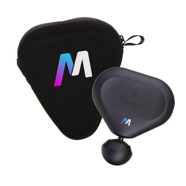 Die Theragun Mini kann mit einem farbigen Aufdruck, einer Banderole und einer Tasche mit farbigem Thermodruck personalisiert werden.