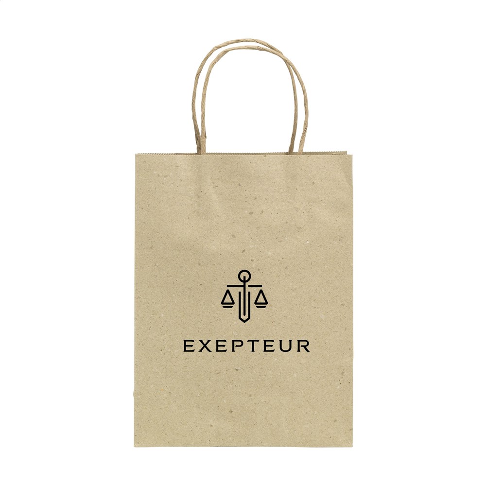 Stabile Papier-Geschenktasche (Größe M) aus recyceltem Graspapier (120 g/m²). Durch die Verwendung natürlicher Materialien sind Unregelmäßigkeiten im Papier spürbar. Dadurch erhält das Produkt eine wunderschöne natürliche Ausstrahlung. Die Tasche hat zwei kurze Papier-Trageschlaufen, einen gefalteten Boden und eine Seitenfalte. Für die Herstellung dieser Tasche werden keine Bäume gefällt.
