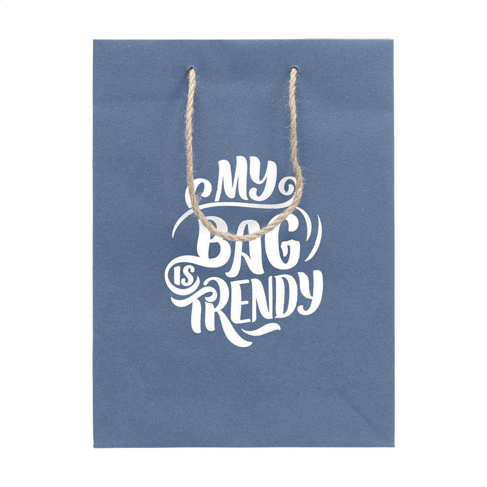 Stabile Papiergeschenktasche (Größe M) aus Recyclingpapier mit Jeansfasern (180 g/m²). Durch die Verwendung von recycelten Jeansstoffen kann die Farbe Blau von Tasche zu Tasche variieren. Die blaue Farbe verleiht der Tasche einen trendigen Look. Die Tasche hat zwei kurze Jute-Trageschlaufen, einen gefalteten Boden und eine Seitenfalte. Geeignet für alle Arten von Werbezwecken. Für die Herstellung dieser Tasche werden keine Bäume gefällt.