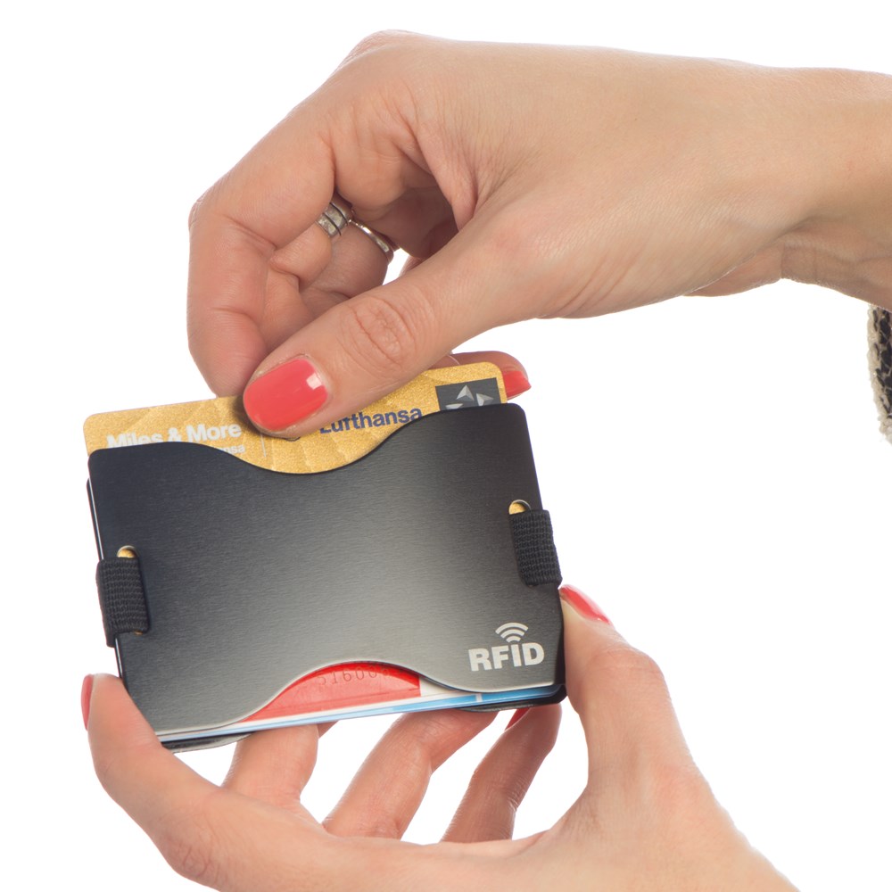 Kartenhalter aus Aluminium mit RFID (Radio Frequency Identification = Funkfrequenzidentifizierung) Schutz, schützt vor unbefugtem Auslesen von z.B. Kreditkarten, Bankkarten, Personalausweis usw. Die Werbung wird auf das Etui gelasert.