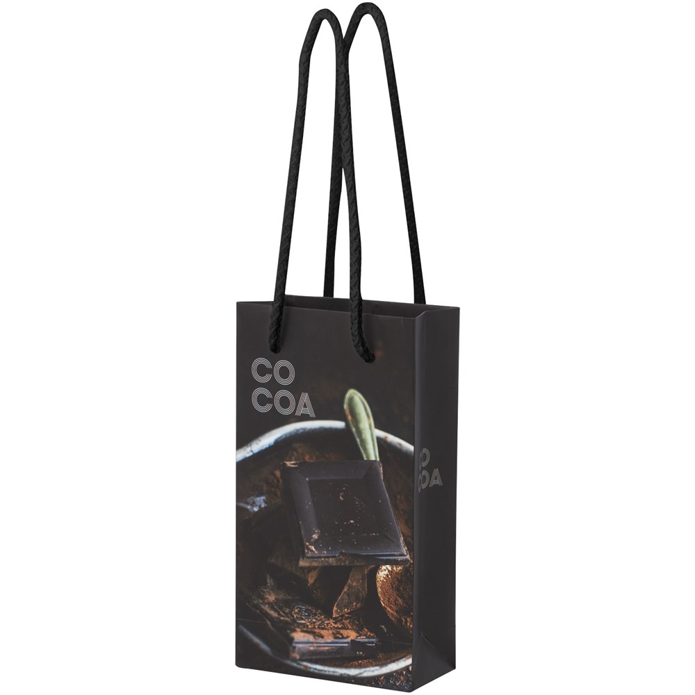 Kleine handgefertigte matte 170 g/m2 Integra-Papiertüte (9,5 × 4 × 17 cm) mit Kordelgriffen. Die personalisierbare Vorder- und Rückseite bietet viel Platz für ein Logo oder ein anderes Design und ist somit ein hervorragendes Marketinginstrument für Unternehmen. Hergestellt in Europa und 100% recycelbar.