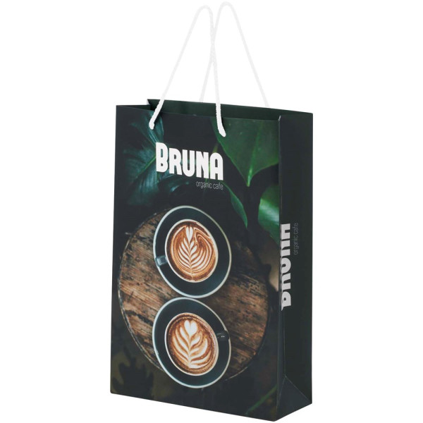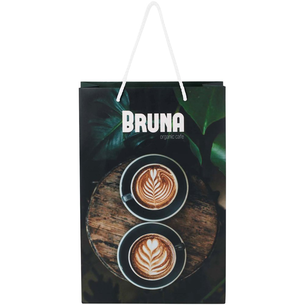 Große handgefertigte matte 170 g/m2 Integra-Papiertüte (24 × 9 × 36 cm) mit Kordelgriffen. Die personalisierbare Vorder- und Rückseite bietet viel Platz für ein Logo oder ein anderes Design und ist somit ein hervorragendes Marketinginstrument für Unternehmen. Hergestellt in Europa und 100% recycelbar.